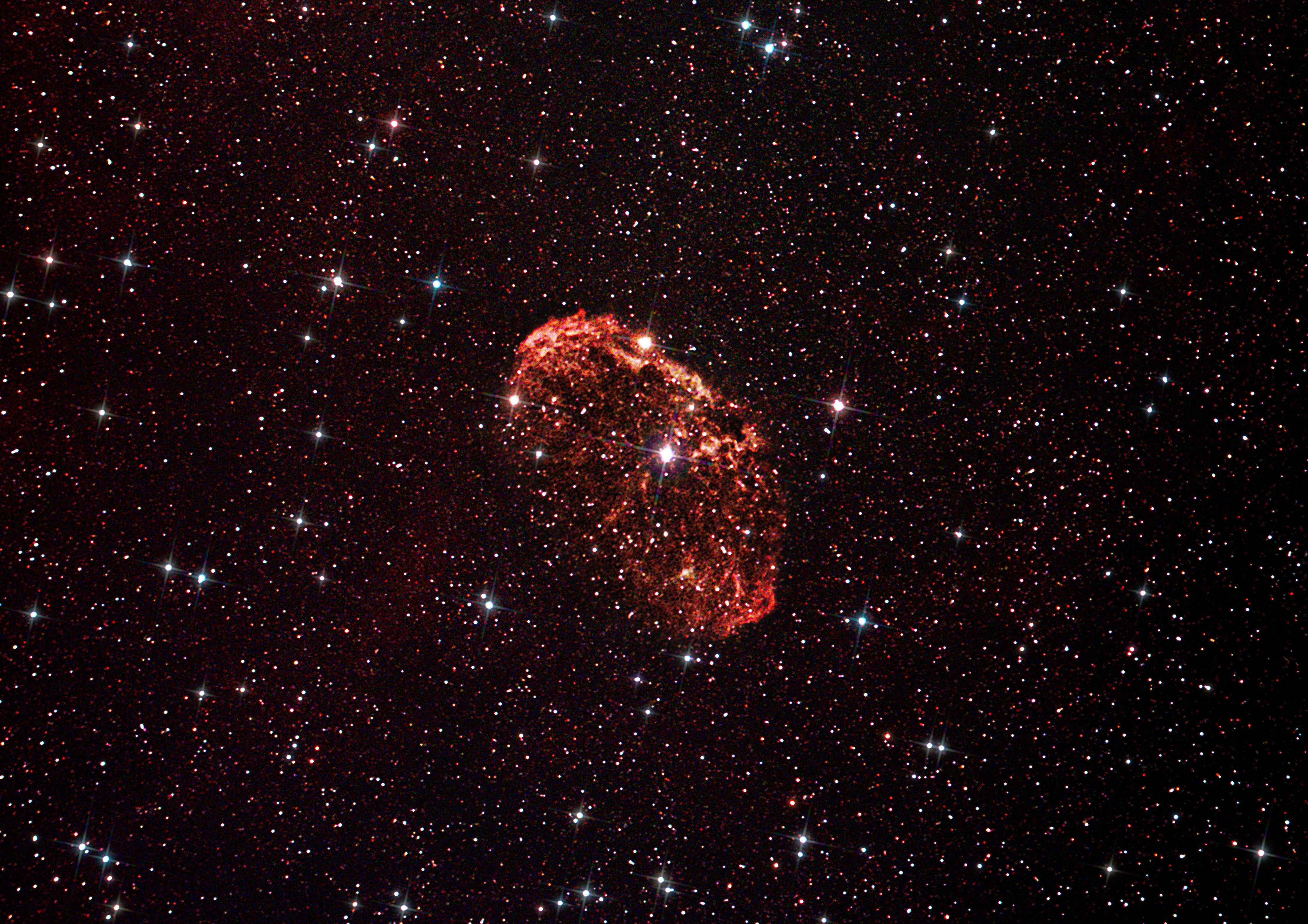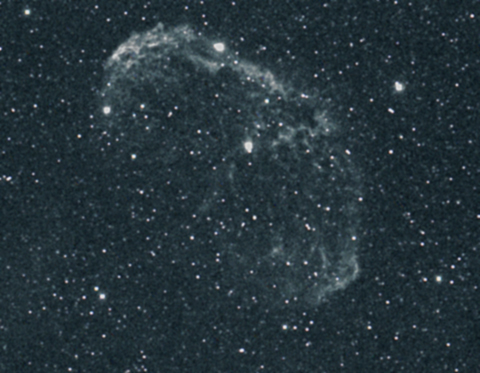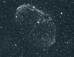 The Crescent Nebula (also known as NGC 6888, Caldwell 27, Sharpless 105) is an emission nebula in the constellation Cygnus, about 5000 light years away. It is formed by the fast stellar wind from the Wolf-Rayet star WR 136 (HD 192163) colliding with and energizing the slower moving wind ejected by the star when it became a red giant around 400,000 years ago. The result of the collision is a shell and two shock waves, one moving outward and one moving inward. The inward moving shock wave heats the stellar wind to X-ray-emitting temperatures.