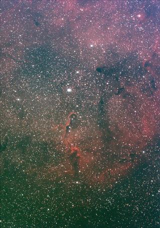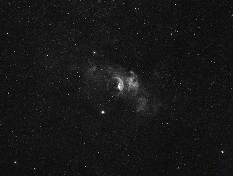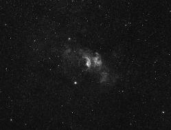 | Ha Filter luminence layer. SXVR-M25C one-shot color camera. RAW conversion via Nebulosity to bin 2x2 and then up-sized 200%. Dust and Scratch feature used to accentuate the gases and minimize stars. |