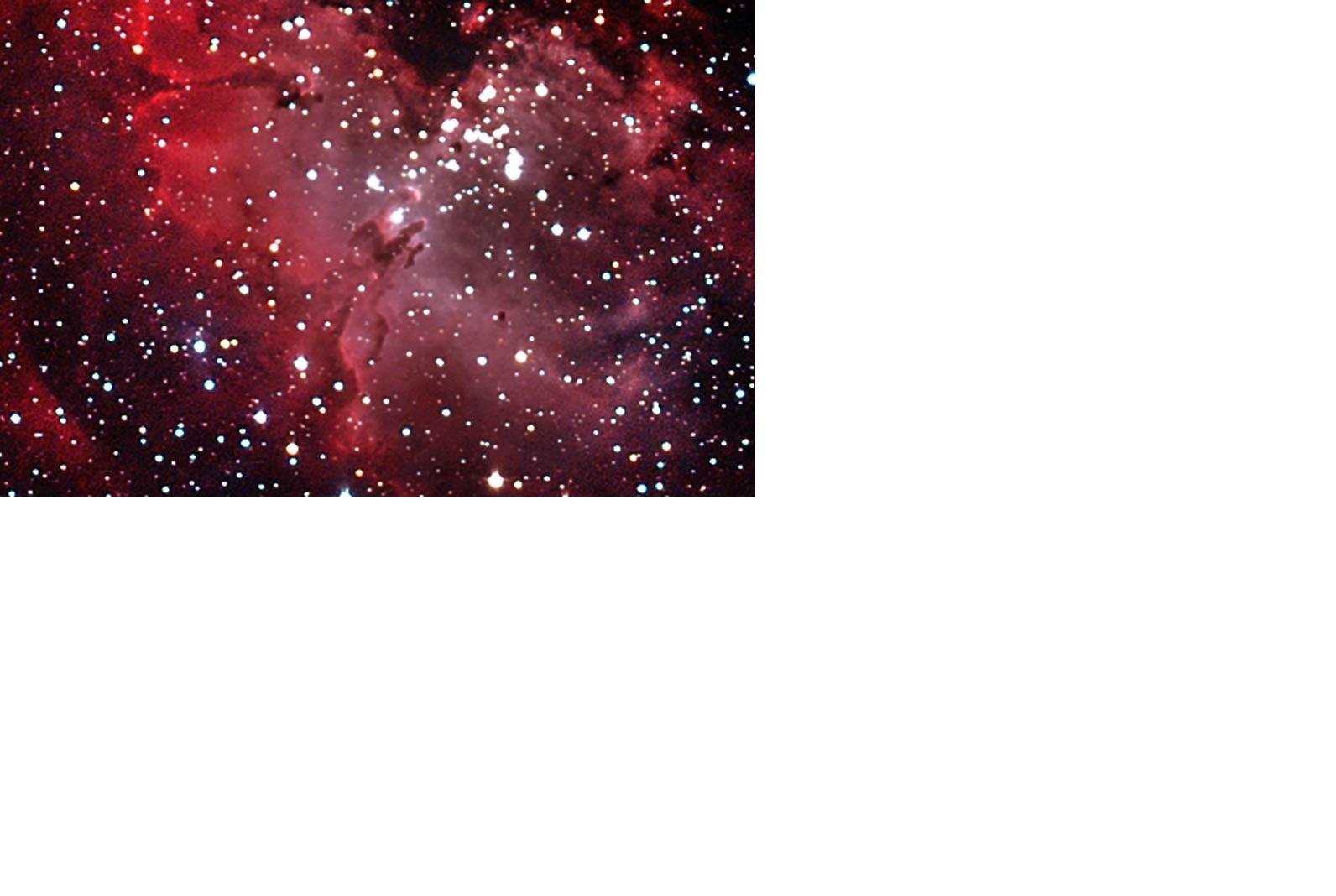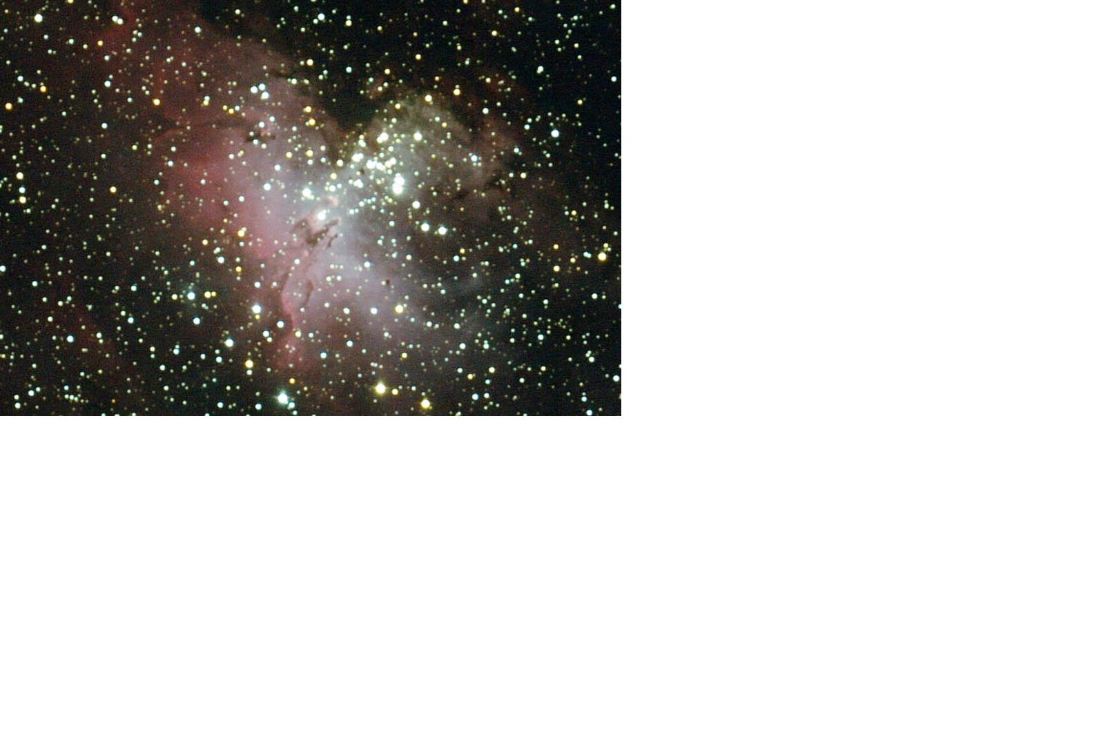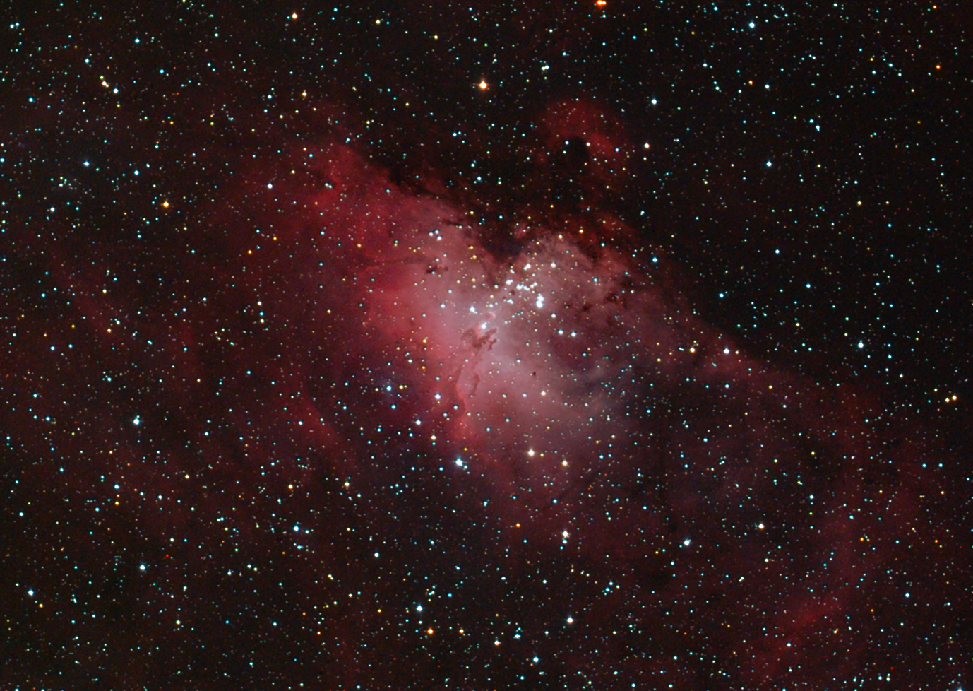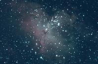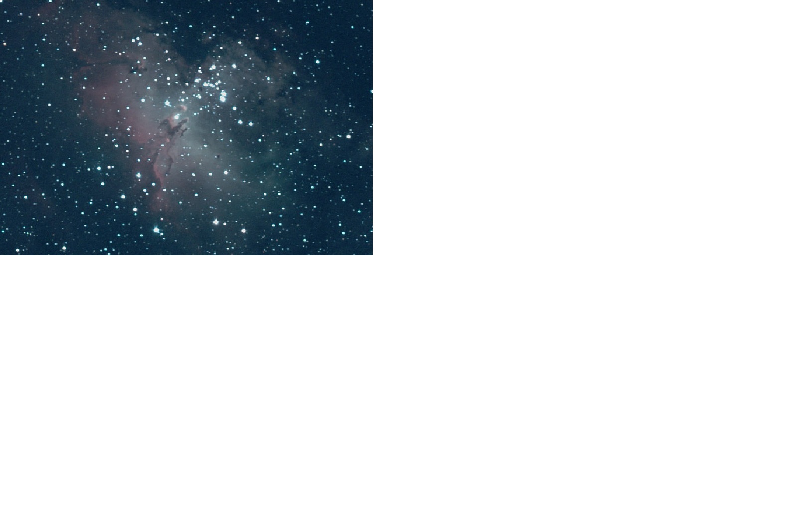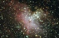 | The Eagle Nebula (M16) and Pillars of Creation Region: The Eagle Nebula is part of a diffuse emission nebula, or H II region, which is catalogued as IC 4703. This region of active current star formation is about 6,500 light-years distant. The tower of gas that can be seen coming off the nebula is approximately 100 trillion km (60 trillion miles) high. Dark Sky Image Location: My cousin Mr. Jay Smith's river property, Hawkinsville, GA - April 4, 2011. Imagers: Michael DeMita and Greg Myers - 4/4/2011 |
