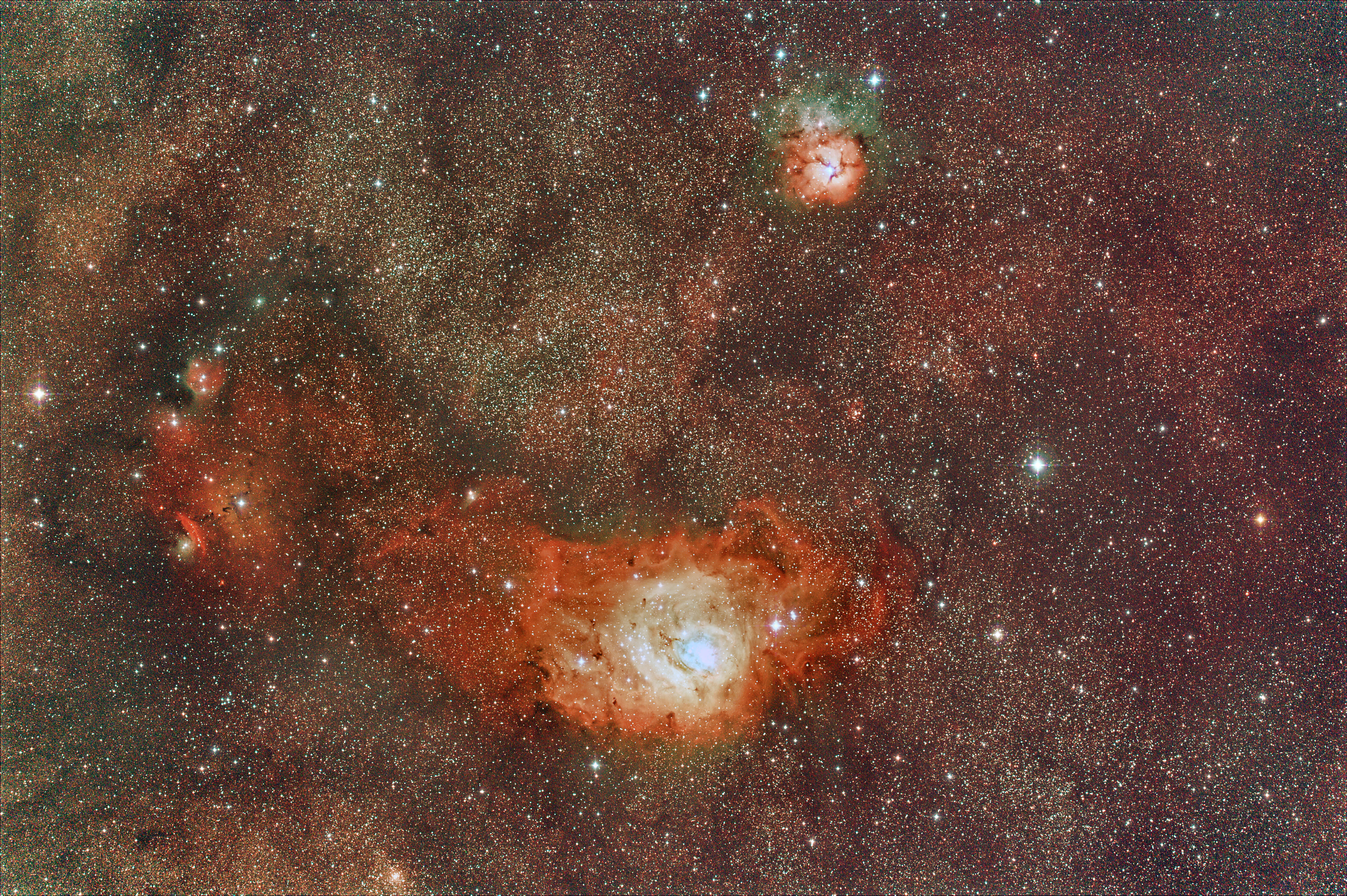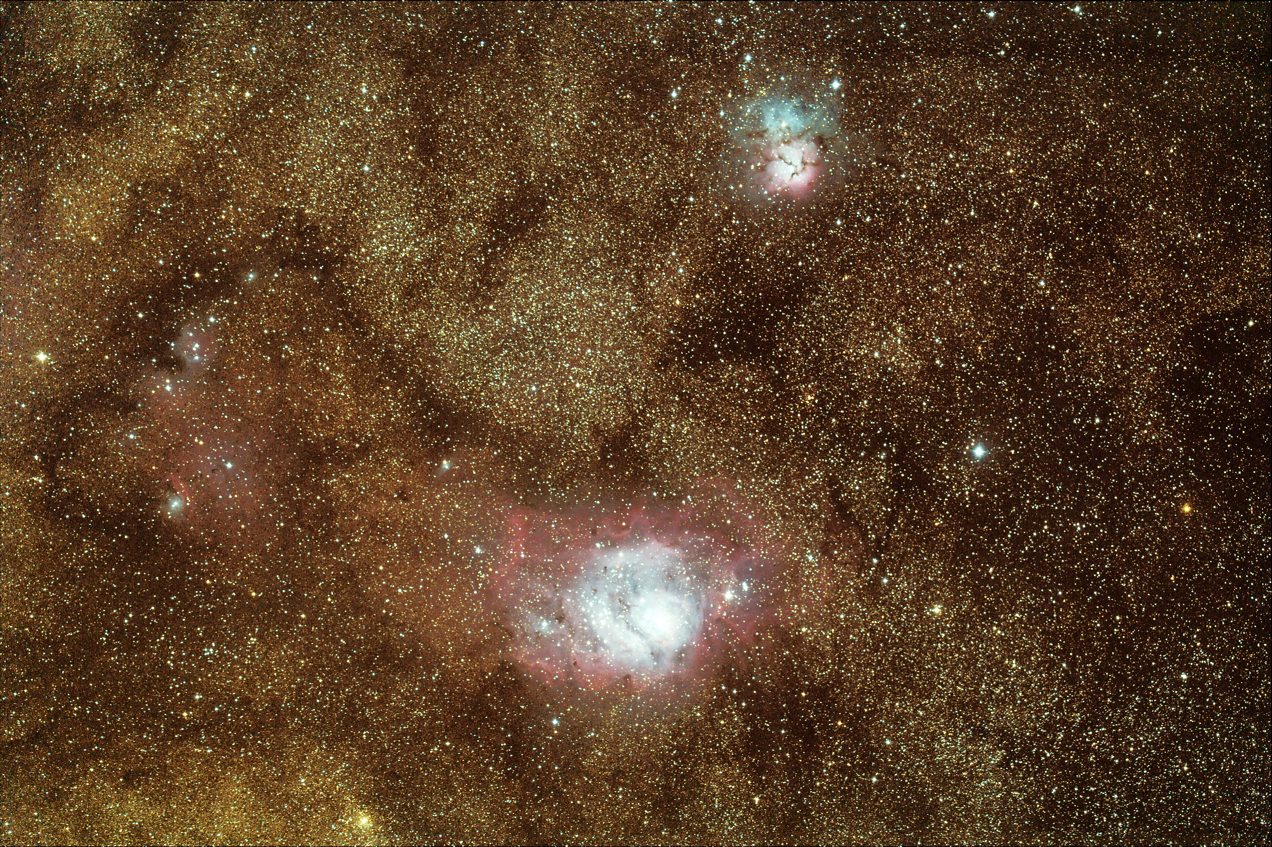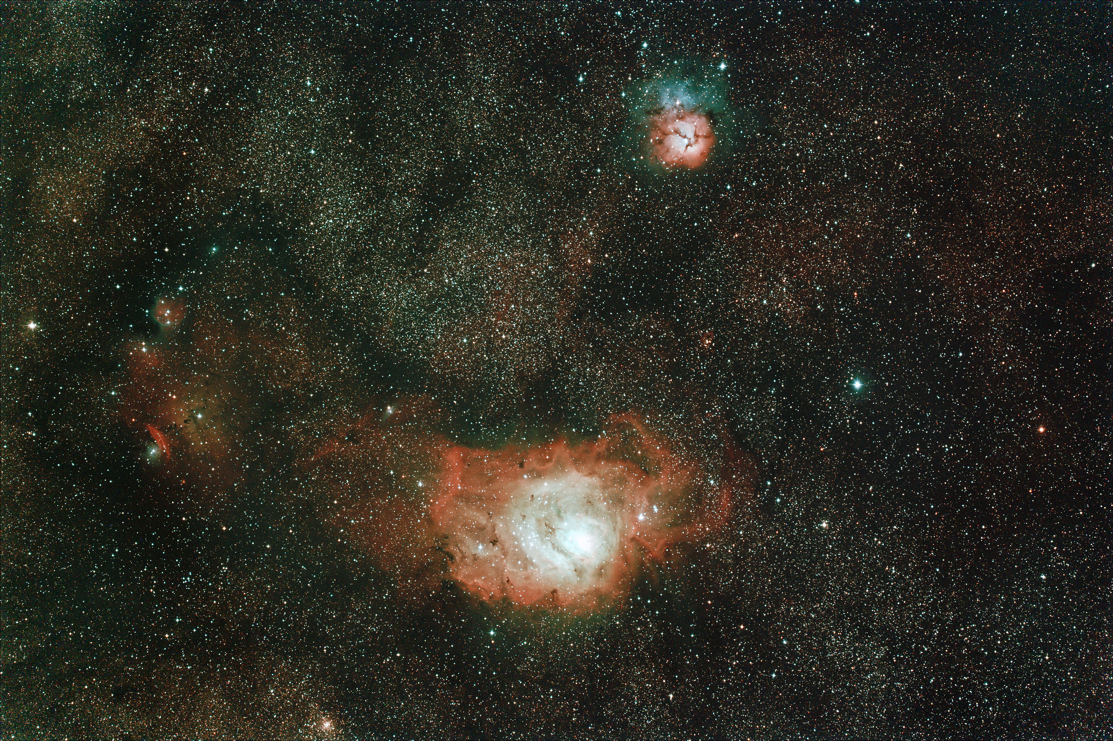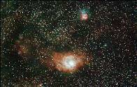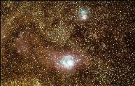 Over 70,000 stars were counted by the Deep Sky Stacking software during the stacking of this total of one hour of exposures. These nebula are part of an emission and HII star forming region in Sagittarius. The surrounding dense star clouds are reflective of their location in line with our galactic core. Distance from Earth: 4,100 light years. Width: 50-100 light years. Dark Sky Image Location: My cousin Mr. Jay Smith's river property, Hawkinsville, GA - April 4, 2011. Imagers: Michael DeMita and Greg Myers - 4/4/2011 |