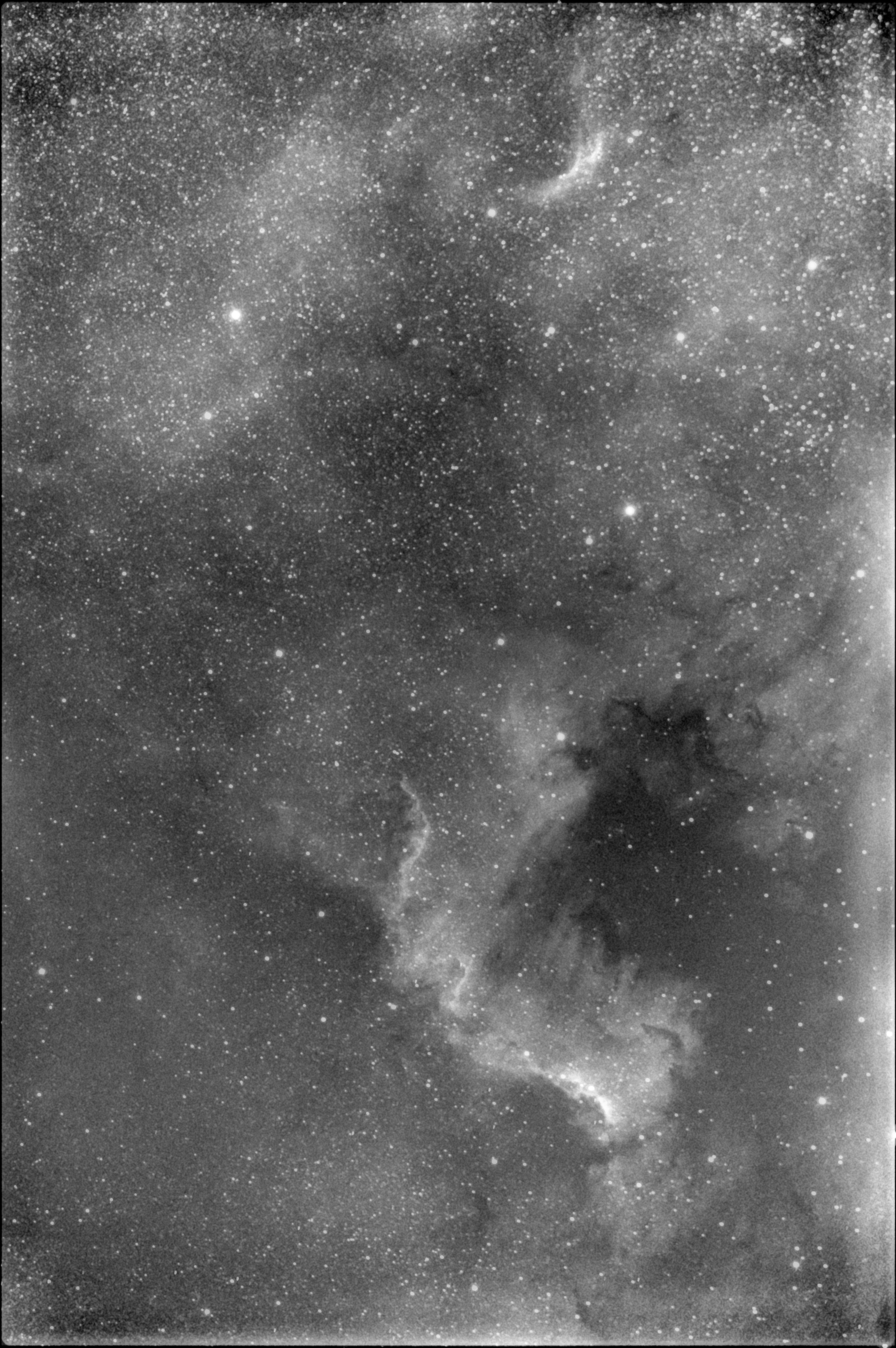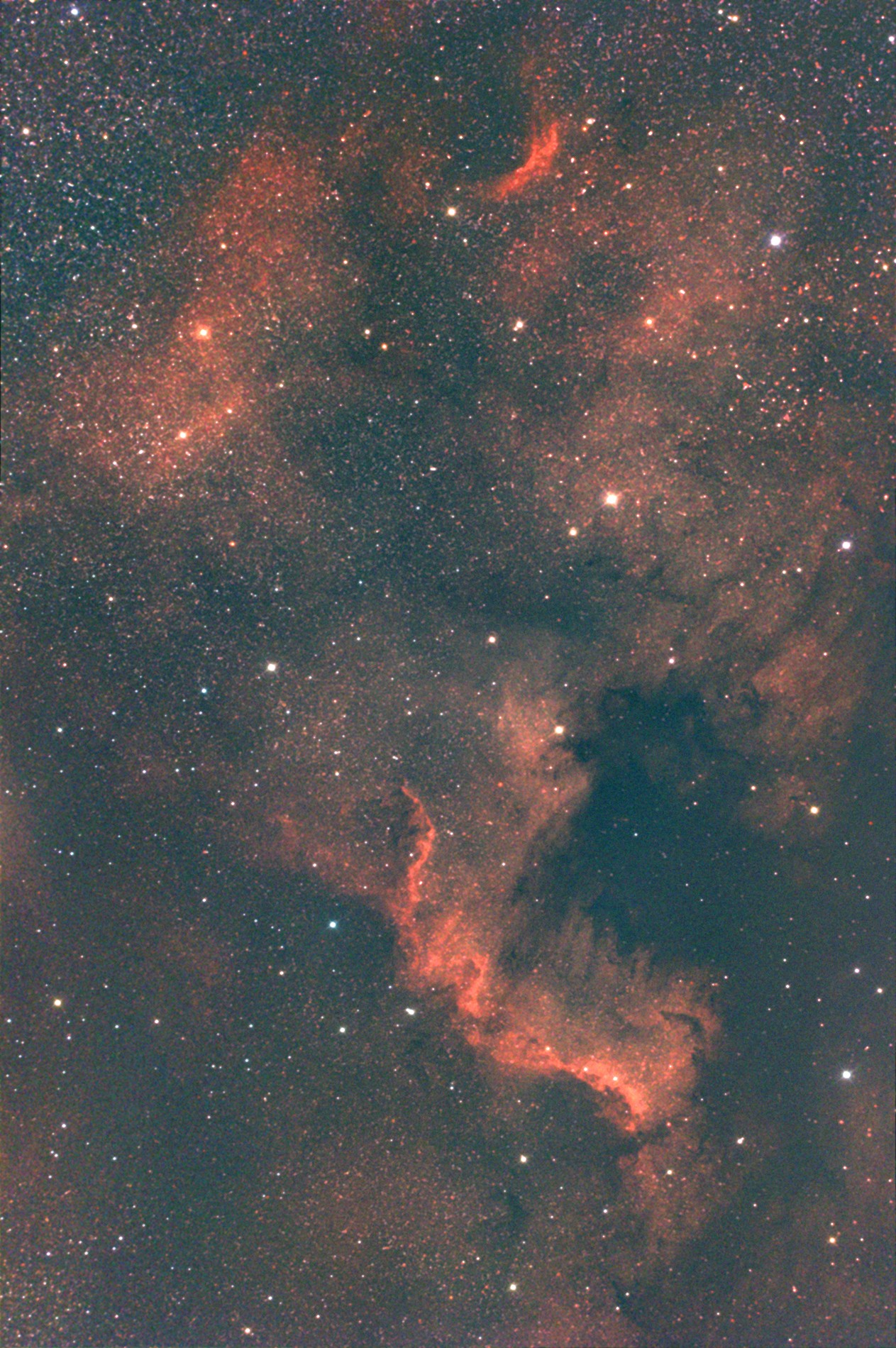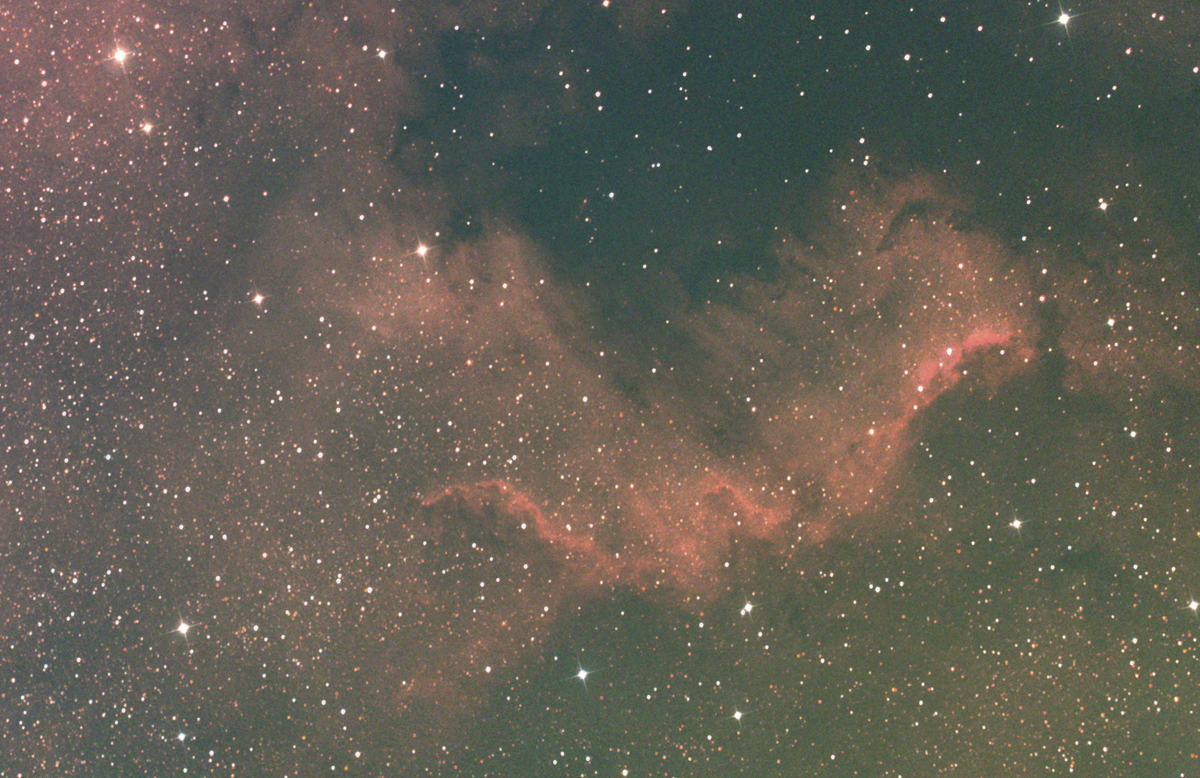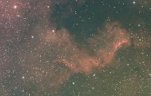The North America Nebula (NGC 7000 or Caldwell 20) is an emission nebula in the constellation Cygnus, close to Deneb (the tail of the swan and its brightest star). The remarkable shape of the emission nebula resembles that of the continent of North America, complete with a prominent Gulf of Mexico. Located about 1500 light- years away from Earth, the two nebulae measure about 50 light-years across. Sir William Herschel discovered the nebula on 24 October 1786, from Slough, in England. Cygnus's Wall is a term for the "Mexico and Central America part" of the North America Nebula. The Cygnus Wall exhibits the most concentrated star formations in the nebula.