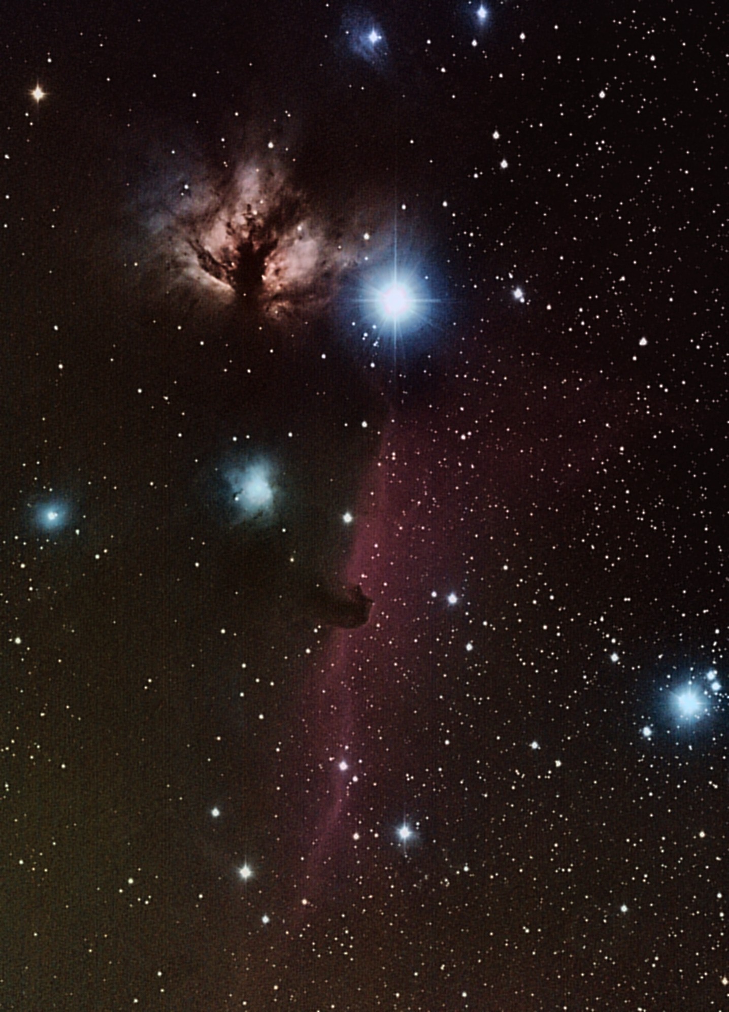 | Orion Constellation. 69 M of 20 and 45 second Frames - IDAS-LP and UHC-S Filter (for luminance). Combination of the two stacks to the right.. |