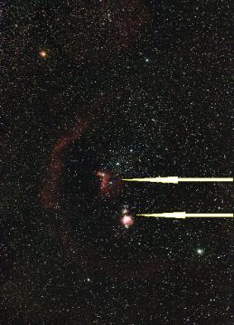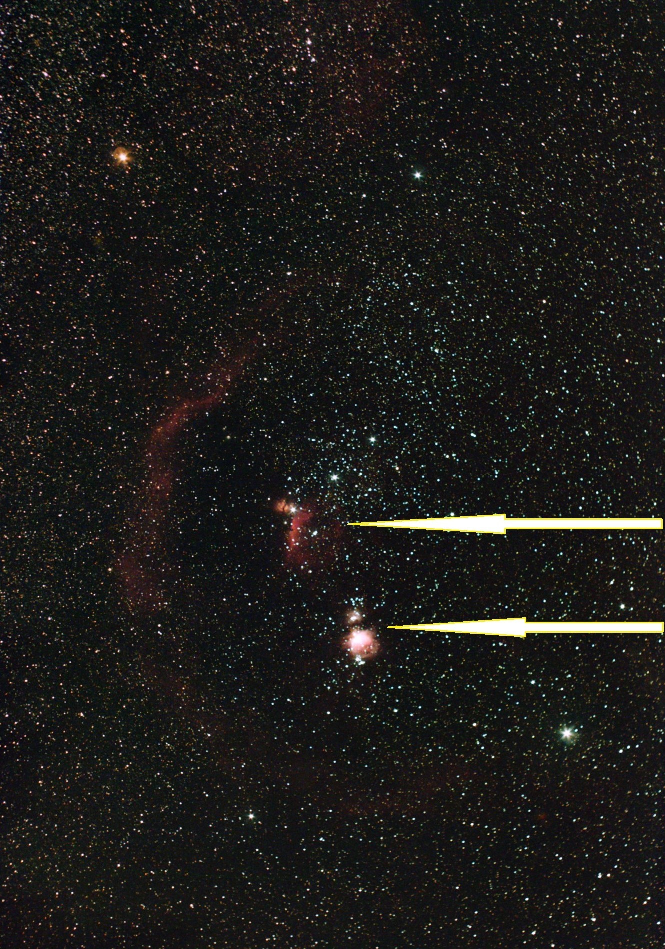 | Arrows in the photo on the left point to regions in Orion that I had imaged at higher magnification with a DSLR and a C11" SCT Scope some time ago. The more detailed photo thumbnails are click-able for high resolution versions. |